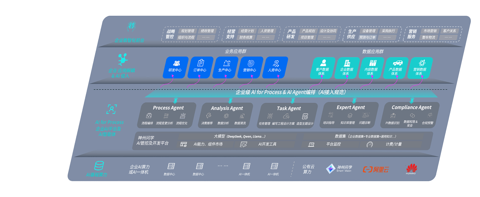 端到端的一站式AI工作空间深度融合了从企业战略规划到日常经营的全流程业务板块,,定向解决车企内部领域多、、、、部门多、、、链条长、、、、场景碎片化等难题,,,支持车企快速构建以AI为核心的生产力写作体系,,实现任务执行与AI能力的无缝集成与交互
