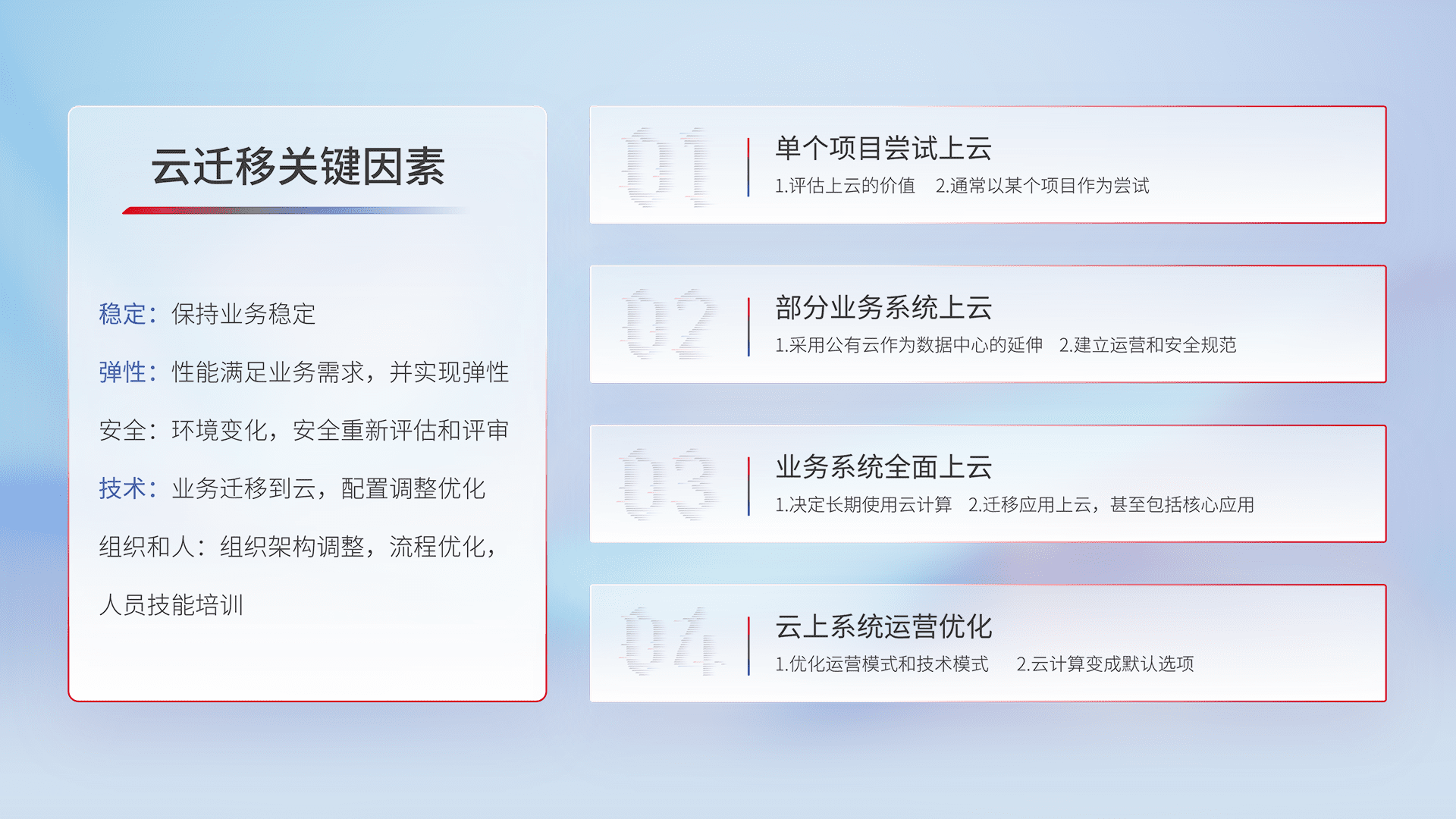 结合实际业务,,,从规划设计、、云平台选型、、云原生改造、、数据迁移、、集成交付,,迁移全过程为客户识别最佳上云路径,,,,做好风险识别管理,,设计网络架构、、身份权限、、安全审计合规、、操作审计、、日志审计、、监控告警策略、、多站点容灾设计等,,,,对云上基础设施进行整体规划,,,,提升IT治理水平,,以满足弹性、、高可用、、高性能的需求。。。。