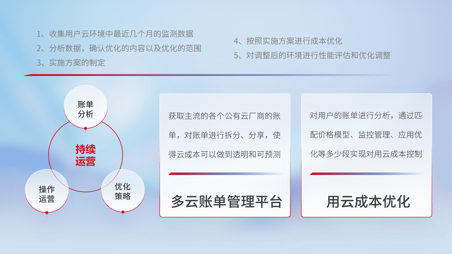 通过多云纳管,,,以统一的资源数据模型把客户的云资源进行抽象和封装,,进而实现对多云资源的统一操作,,保障云资源管理的可靠性、、、稳定性与可用性。。量身定制化运维内容,,配置、、、开发运维、、、、补丁管理、、备份、、、监控、、、认证和访问管理、、、审计和日常巡检等,,保障在用云过程中的可靠度,,稳定度以及高可用率。。